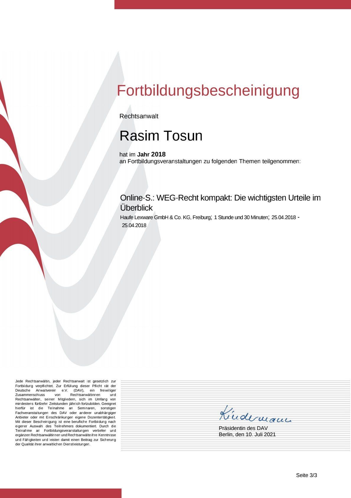 2010 Zulassung als Rechtsanwalt RAK Tübingen